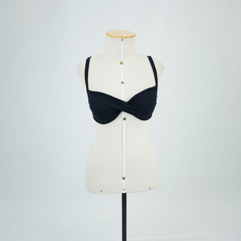 by Michelle Araujo Leia Mais...Top soutien de biquini preto com bojo e centro retorcido, alças laterais e fecho de plástico
