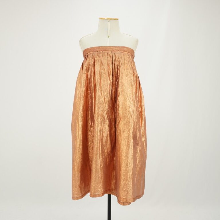 Pano da costa retangular em lamê cobre e brilhante com uma das extremidades com pregas.