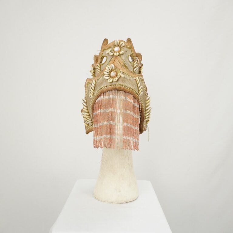 by Michelle Araujo Leia Mais...Acessório de cabeça de base regida revestida com tule bege. A peça tem formato de coroa elevada com recortes vazados orgânicos e franja de miçangas corais e brancas...