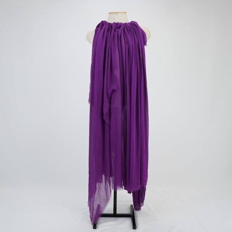 by Michelle Araujo Leia Mais...Vestido roxo uva midi sem mangas, parte do pescoço é uma faixa com amarração com quatro partes de tecido afixadas, dando caimento assimétrico e sem costura