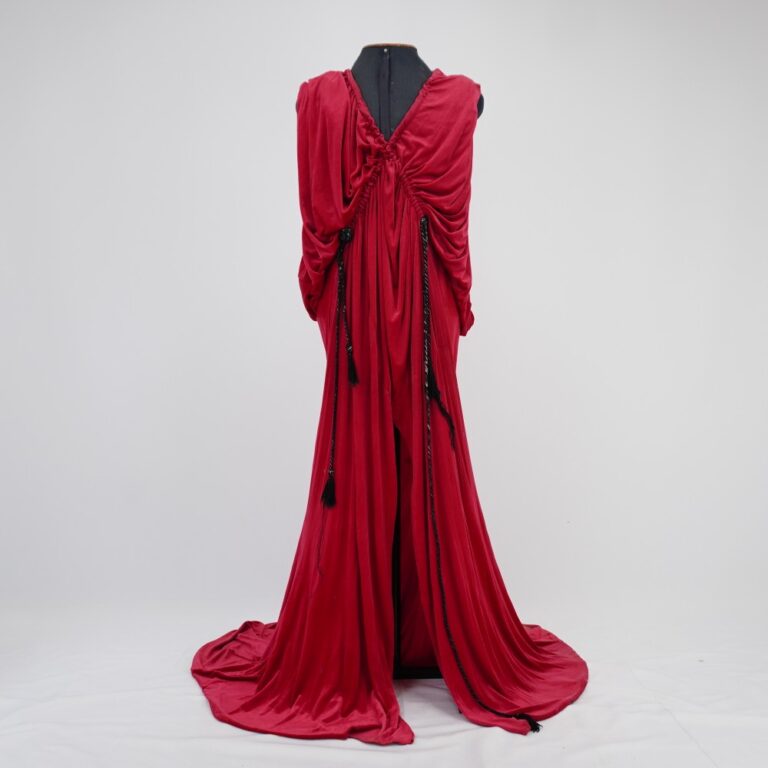 by Michelle Araujo Leia Mais...Vestido longo magenta de veludo molhado, com modelagem ampla, quatro cordões pretos que descem cruzando ao redor do decote ate a cintura criando um drapeado e uma cauda