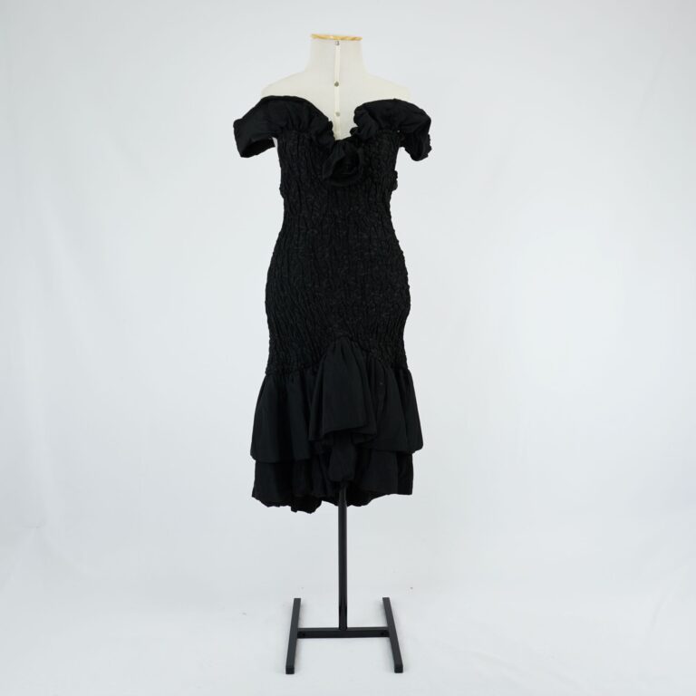 setembro 21, 2025 by Michelle Araujo Leia Mais...Vestido de alça curto com corpo plissado e babados na barra, todo em preto. Zíper e colchetes na lateral, possui barbatanas.