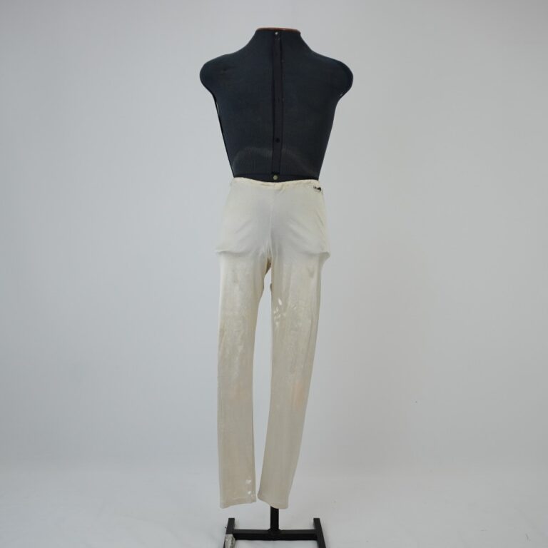 by Michelle Araujo Leia Mais...Calça justa ao corpo em branco perolado com elástico na cintura