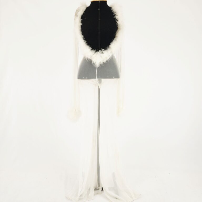 setembro 13, 2025 by Michelle Araujo Leia Mais...Macacão de manga longa offwhite com aplicação de plumas no decote e punhos