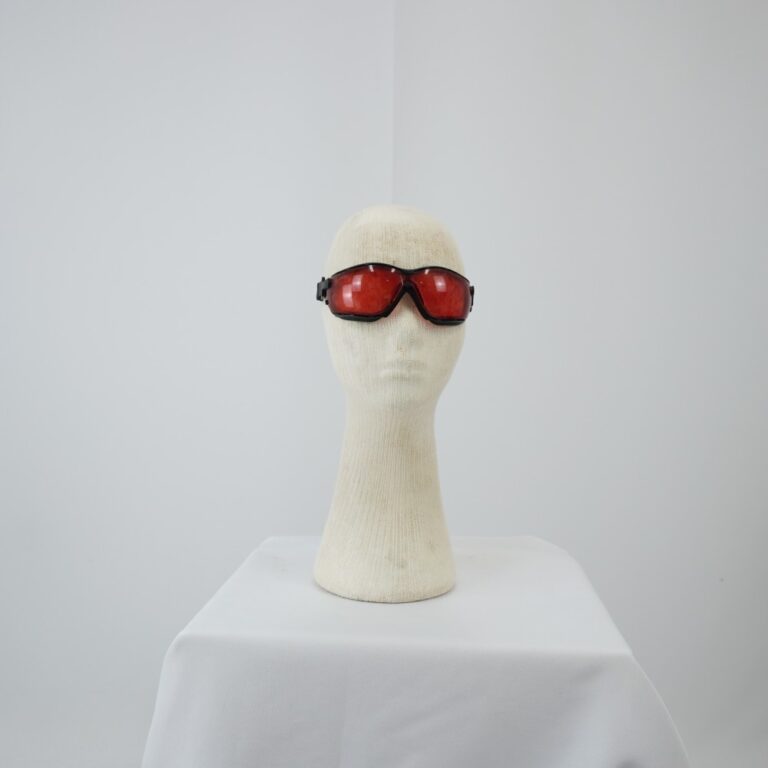 by Michelle Araujo Leia Mais...Óculos de proteção confeccionado em material rígido, com armação e vedação na cor preta, as lentes são translucidas em tom vermelho, fixação na cabeça feita com tira elástica...