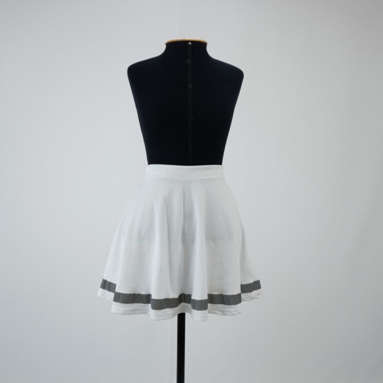 by Michelle Araujo Leia Mais...Saia branca curta godê, fita refletiva cinza aplicada próxima à barra