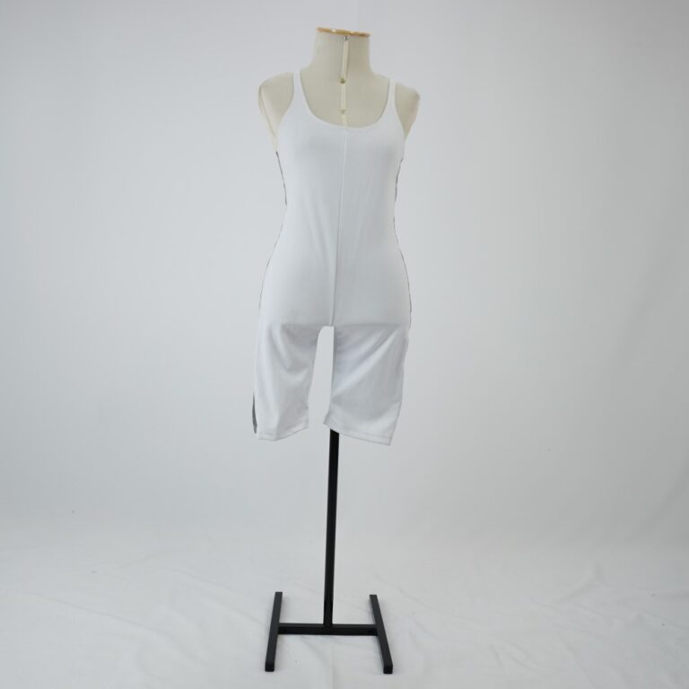 by Michelle Araujo Leia Mais...Macacão branco, sem mangas, curto, com fita refletiva aplicada nas costuras laterais