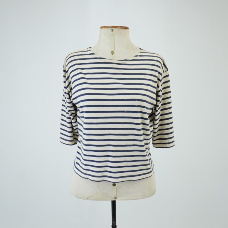 by Michelle Araujo Leia Mais...Camiseta branca com listras azuis, manga três quartos e gola careca.