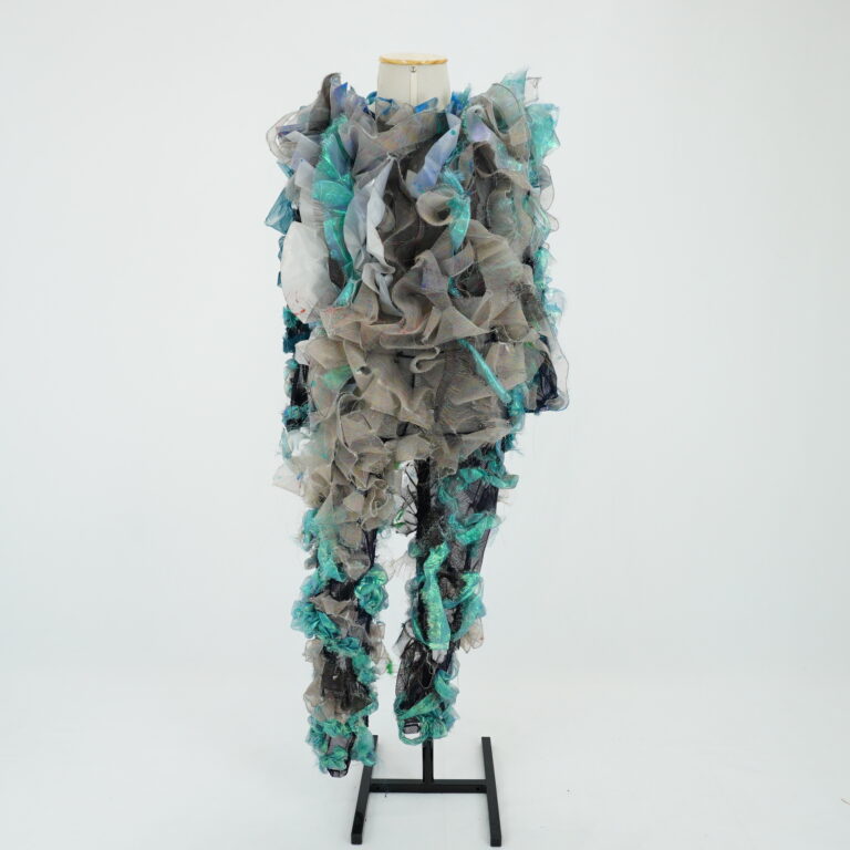 by Michelle Araujo Leia Mais...Macacão com mangas longas, composta por base de tule de malha azul marinho, com apliques a mão de texturas com diferentes cores de organza brilhante, furta cor, verde,...