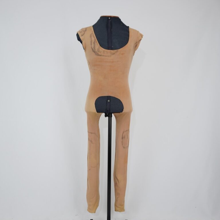 by Michelle Araujo Leia Mais...Macacão sem mangas, cor bege claro, região da pelve recortada, estampa manual orgânica em marrom e preto