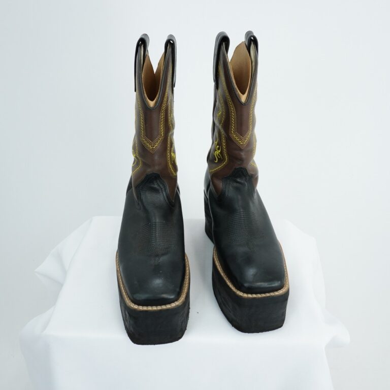 by Michelle Araujo Leia Mais...Par de botas estilo country marrom e prata, com plataforma reta preta, bordados nas laterais em amarelo e bege, faixa lateral em couro preto e bordados em preto...