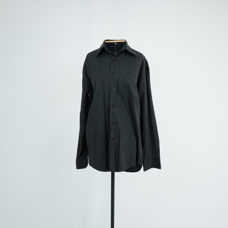 by Michelle Araujo Leia Mais...Camisa preta com listras verticais cinzas. Manga longa oito botões frontais, bolso frontal lado esquerdo, 3 botões nos punhos.