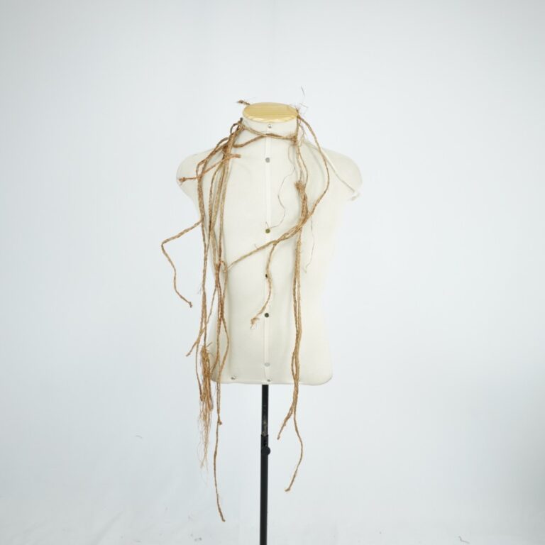 Saia de palha trançada em fibras vegetais, estruturada em cós trançado de onde saem franjas irregulares. Fechamento por amarração.