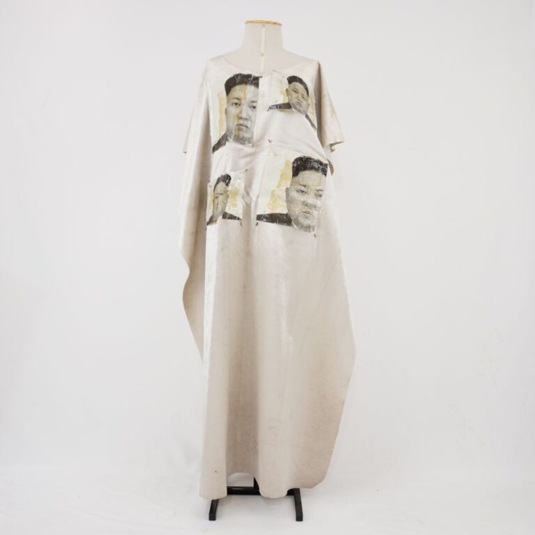 by Michelle Araujo Leia Mais...Capa longa cinza com decote redondo. 5 imagens sendo 4 frontais e 1 traseira em preto e branco de Kim Jong-Un fixadas com cola e alfinete de segurança.