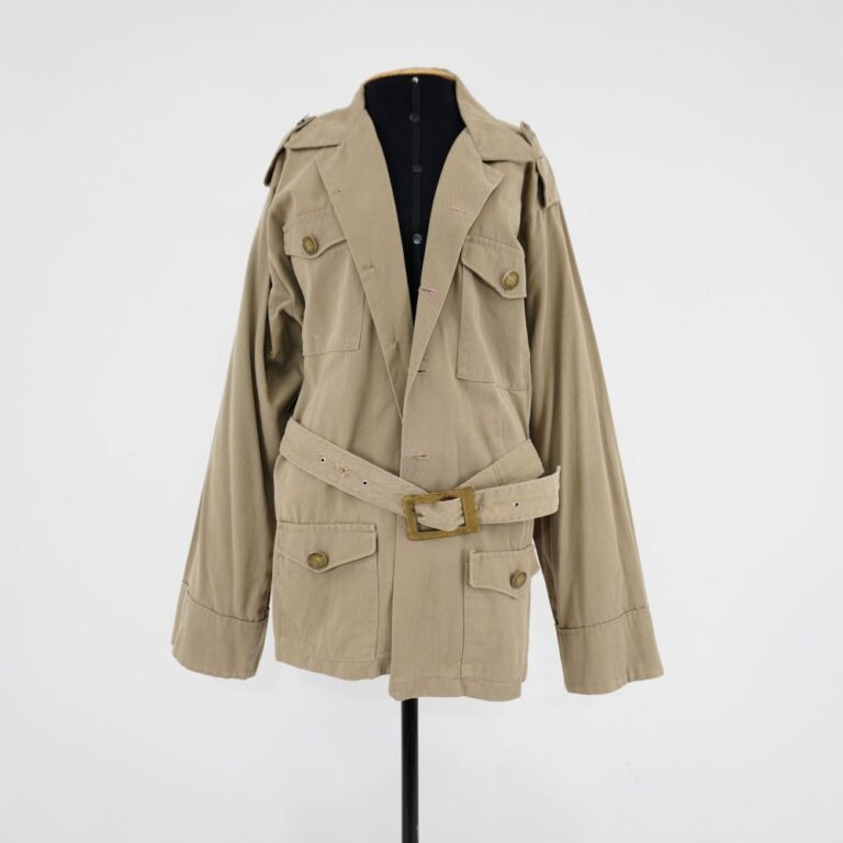 by Michelle Araujo Leia Mais...Jaqueta tipo parka bege. 4 bolsos frontais, fechamento em botões dourados de metal. Ombreira e cinto costurado nas costas com dois passantes. Ilhós prateados e fivela dourada.