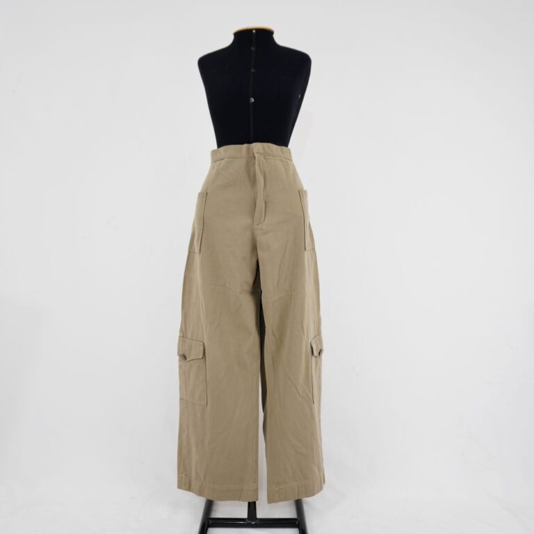 by Michelle Araujo Leia Mais...Calça reta bege com 2 bolsos laterais e 2 botões dourados. Elástico na parte traseira do cós. Fechamento por zíper e colchete de alfaiate.