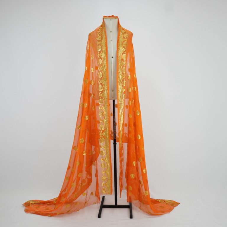 by Michelle Araujo Leia Mais...Lenço retangular de tecido leve laranja com brocados dourados em duas laterais e nos detalhes circulares entre as barras por toda a peça. Duas laterais com barra a...