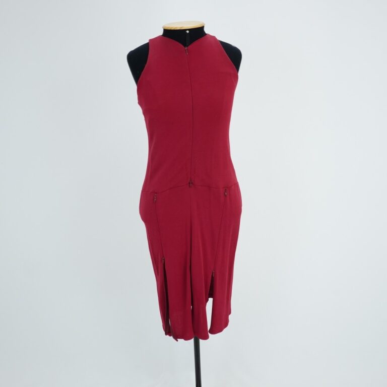by Michelle Araujo Leia Mais...Vestido curto sem manga cor cereja. Possui seis zíperes, sendo um no busto meio frente e cinco na parte frontal da saia. O zíper do busto tem cursor...